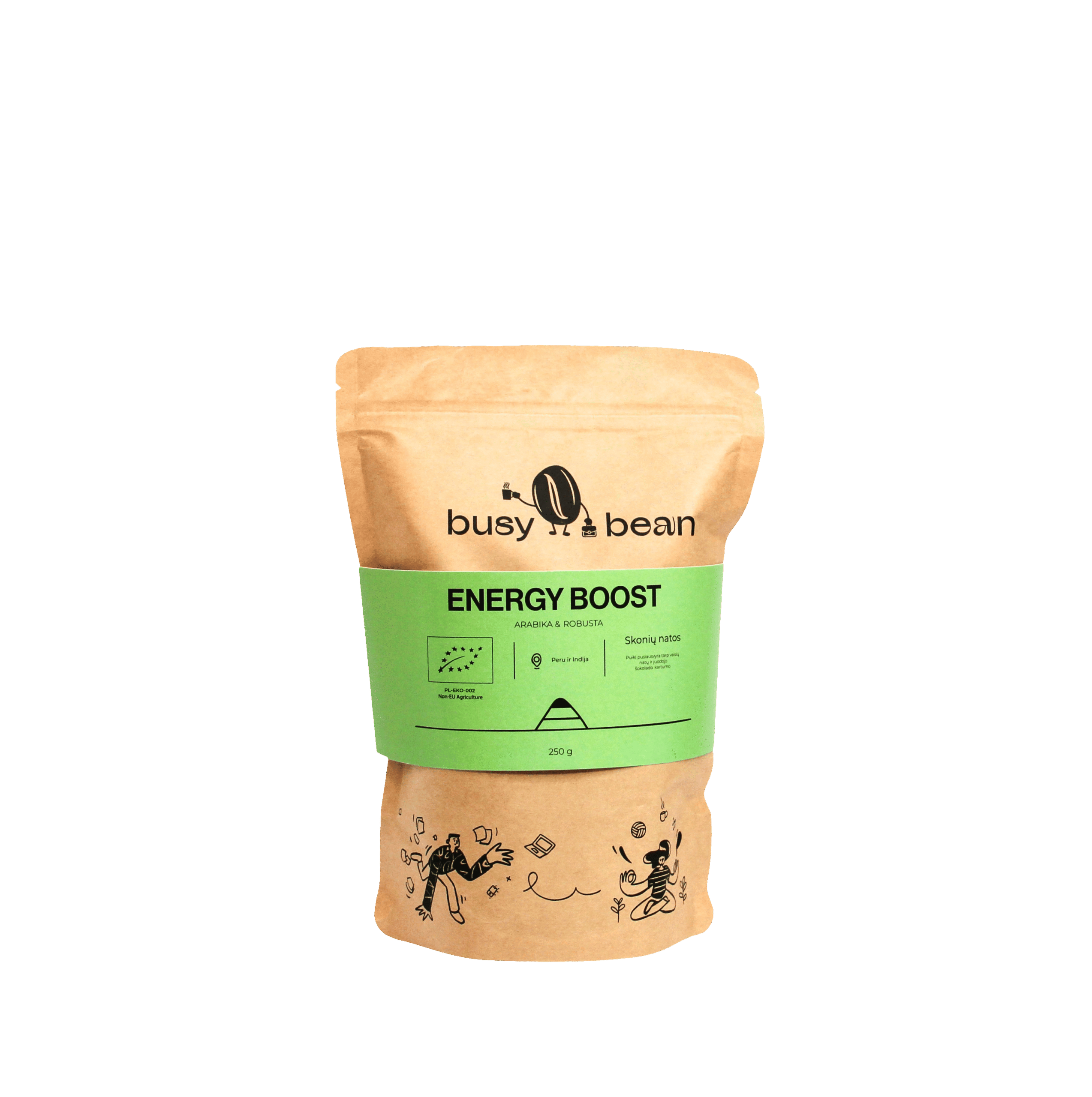 Ekologiškos kavos pupelės Energy boost – vienos geriausių Peru arabikos kavos vaisių ir unikalios robustos iš Indijos šokolado bei aštrių natų derinys.